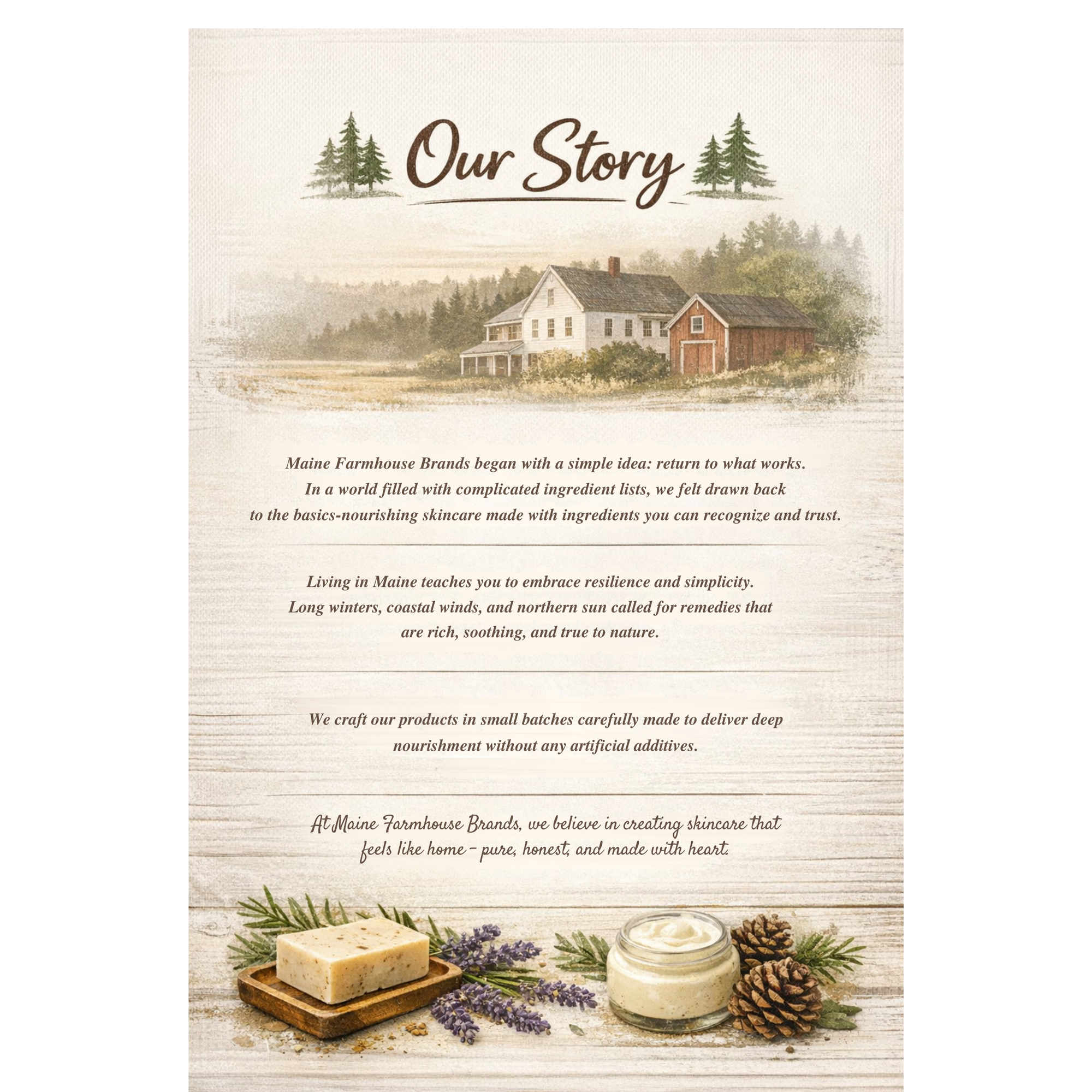 At Maine Farmhouse Brands, we take great care in formulating products designed for all skin types. By meticulously selecting non-irritating and all-natural ingredients, we ensure our products cater to the unique needs of your skin. Our dermatologist-approved formulations are free from harsh chemicals and common allergens, reducing the risk of adverse reactions. Nourishing botanical extracts and natural emollients, like olive oil, grass-fed tallow, and shea butter, provide soothing hydration while strengthening the skin's natural barrier. With our commitment to safety, transparency, and effectiveness, we offer a range of skincare solutions that promote comfort, confidence, and the well-being of all our customers with sensitive skin.
